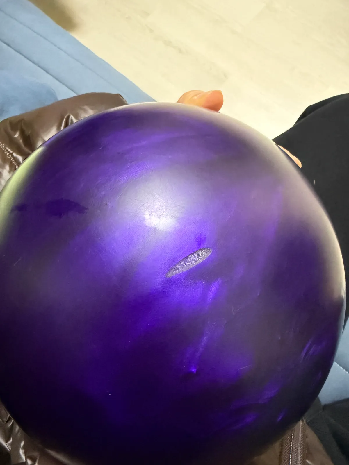 볼링공은 사용감이 있으며, 표면에 스크래치와 지공 흔적이 있습니다. 볼링화는 흰색과 검은색 조합으로, 밑창에 사용감이 있고 전반적으로 깨끗한 편입니다.